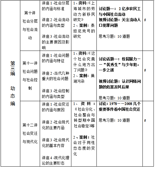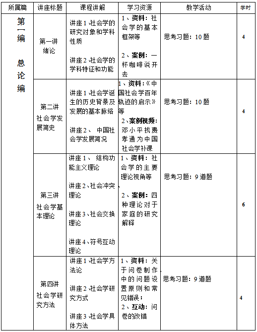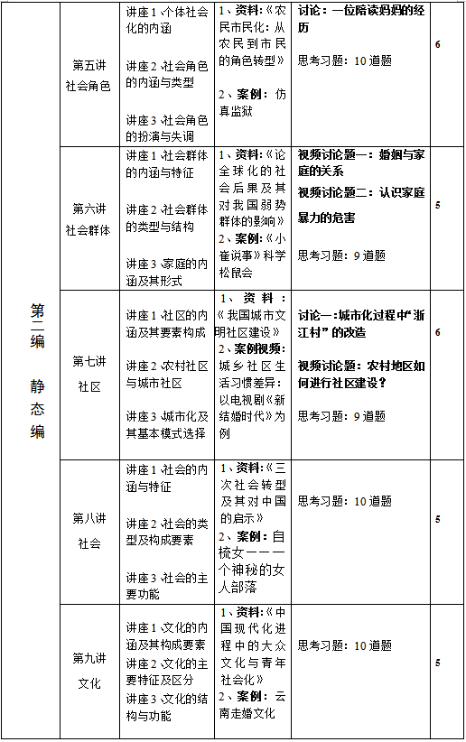 本门课程将密切结合我国的社会实际,在充分吸收社会学最新研究成果的基础上,全面、系统地介绍社会学学科的基本范畴、主要理论和研究方法,并重点介绍社会角色、群体、社区、社会、文化、社会分层与社会流动、社会问题与社会控制、社会变迁与社会现代化等方面的内容。