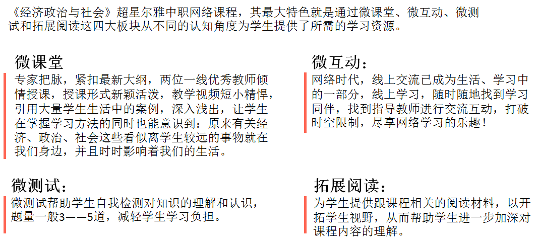 该课程是中等职业学校学生必修的一门德育课,32课时,共五大章,32小节,每个小节有四大板块构成,即微课堂、微互动、微测试和拓展阅读,课程紧扣最新大纲,以贴近学生,贴近实际,贴近生活的教学内容,对学生进行马克思主义相关基本观点教育和我国社会主义经济、政治、文化、社会以及生态文明建设常识教育。让学生认同我国的经济、政治制度,了解所处的文化和社会环境,树立中国特色社会主义共同理想,积极投身我国经济、政治、文化、社会建设以及生态文明建设。