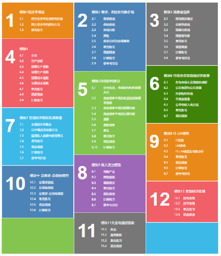 本课程主要的内容包括微观经济学和宏观经济学的基本概念和理论。微观经济学部分,重点介绍消费者理论和生产者理论,主要包括供需分析、不确定性、寡头垄断市场结构等,并简要介绍几种市场失灵的情况。宏观经济学部分,我们将重点介绍GDP及其构成、消费和储蓄、货币与物价、短期经济波动等内容。其中微观经济学部分的生产者、消费者以及竞争性市场为本课程的重点内容,对于管理经济学至关重要的部分为市场结构和竞争策略,而宏观经济学部分的内容对于管理者分析宏观经济环境、评估市场风险都是重要的理论基础。通过本课程,学生对经济学理论大厦将具有一个基本的认识,为今后进一步学习经济学打下良好的基础。