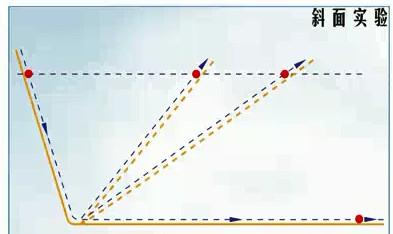 斜面实验:在轨道的一边释放一颗钢珠,如果忽略摩擦力带来的影响,我们发现钢珠从左边滚下后,再从右边的斜面滚上,钢珠将上升到与左边释放高度相同的点;若将右边的倾斜角减小,钢珠还是上升到原来的高度,但通过的路程比原来更长;假设右边的轨道为水平,钢珠想要达到原来的高度,但是钢珠无法达到原来的高度,钢珠将永远运动下去。