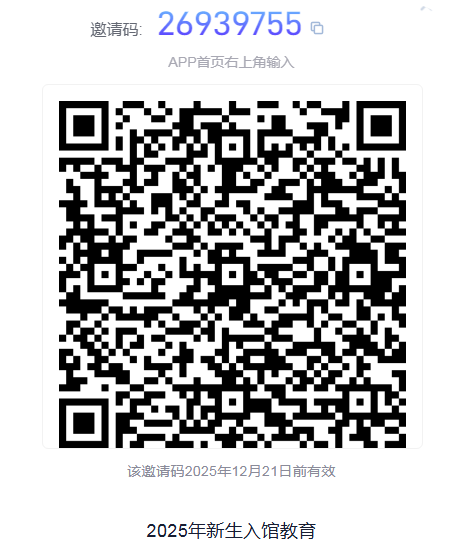 微信搜索关注“中南林业科技大学图书馆”微信公众号--“我的图书馆”--“入馆教育”--"目录",学习使用图书馆的相关知识;或者手机下载“学习通”APP,扫描下方二维码或者直接输入邀请码“26939755”,进入“入馆教育”课程进行学习和测试。