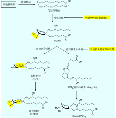 在研究花生四烯酸生物合成及PG的衍生物代谢时发现,PG与导致炎症有关,血栓素A2侧是促使血小板凝聚形成血栓的原因。这一发现不但解释了非甾类抗炎药的作用机制,同时发现了Aspirine 作为预防血栓的新用途。常见的PGs类药物见下图