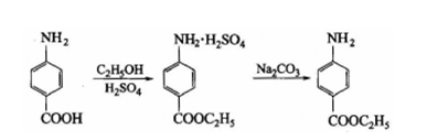 由于酯化反应有水生成,且为可逆反应,故使用无水乙醇和过量的硫酸。酯化产物与过量的硫酸形成盐而溶于溶液中,反应完毕加入碳酸钠中和,即得苯佐卡因。