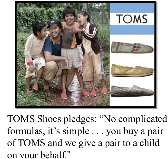 Toms Shoes pledges:"No complicated formulas, it's simple... you buy a pair of TOMS and we give a pair to a child on your behalf."