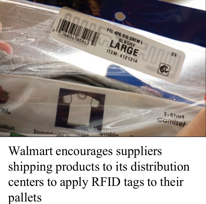 Walmart encourages suppliers shipping products to its distribution centers to apply RFID tags to their pallets.