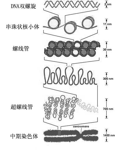 染色质的基本结构单位是核小体。核小体→螺线管→超螺线管→染色质。因此,从线性DNA分子到染色单体,DNA共压缩了约8400倍