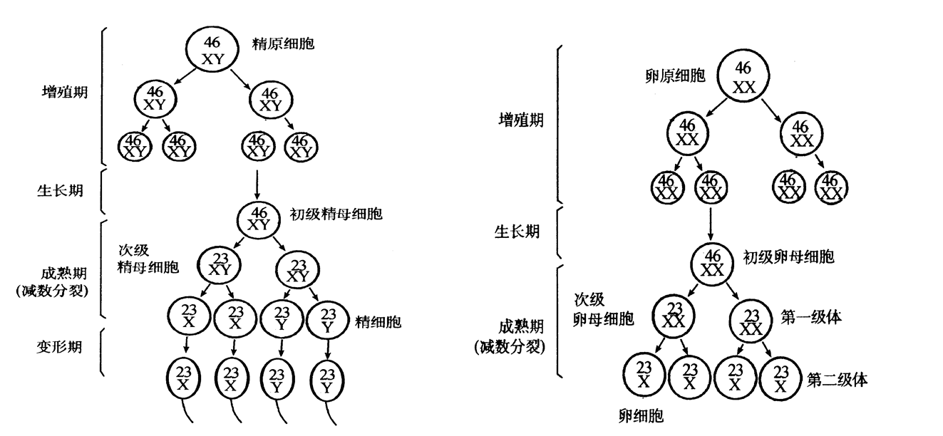 配子发生是指精子和卵子的形成过程。亲代通过配子形成将遗传信息储藏在精子和卵子中,通过受精传递给子代,从而保证了物种的延续性。精子和卵子的形成都经过增殖、生长、成熟等过程,两者在空间和时间上有一定差异,但在成熟期中进行减数分裂的过程基本相似。