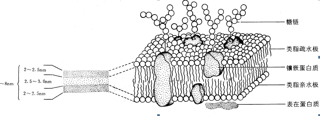 三层结构,即内外两个电子致密的“暗”层中间夹着电子密度低的“亮”层,其总厚度约为7nm,这三层结构称为单位膜。目前较为公认的是“液态镶嵌模型”学说。细胞膜的成分是脂质(磷脂)、蛋白质、糖类。细胞膜的功能是维持细胞形态、保护细胞、细胞内外物质转动、细胞内外信息传递、与细胞识别、黏着、免疫有关。