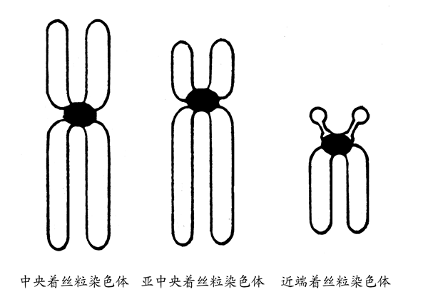 在细胞周期中以细胞分裂中期最为典型,称为中期染色体。每一个中期染色体均由两条染色单体构成,每一条染色单体由一个DNA分子螺旋而成,两条染色单体互称为姐妹染色单体。两条染色单体通过一个着丝粒彼此相连,此处相对解旋,浅染并内缢,称着丝粒或主缢痕。着丝粒区有一特殊结构为纺锤丝附着位点,在细胞分裂时与染色体移动有关。着丝粒将染色体分为两臂,较长的称为长臂(q),较短的称为短臂(p),两臂末端各有一特化部分称端粒,其为高度重复的DNA,端粒是染色体稳定的必要条件。若端粒缺失,则染色体末端将失去其稳定性,发生染色体间非正常连接,形成畸变染色体。在某些染色体臂上也可见到浅染内缢的区段称副缢痕或次缢痕。人类近端着丝粒染色体的短臂末端有一球形小体称随体,随体与短臂间的细丝样结构称随体柄,实际上也属于次缢痕区,此处是核糖体RNA(rRNA)基因存在的部位。其表达产物与构成核仁及维持核仁结构和形态相关,又称为核仁组织者