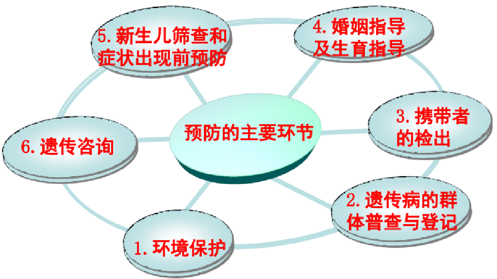 遗传咨询和产前诊断:通过咨询可以发现遗传病患者,并以此对患者及有关家系成员进行婚姻、生育指导,这是预防该病在家系中再发的最基本措施。通过产前诊断,可对患病胎儿及时进行选择性流产,这是保证健康后代出生的有效手段。