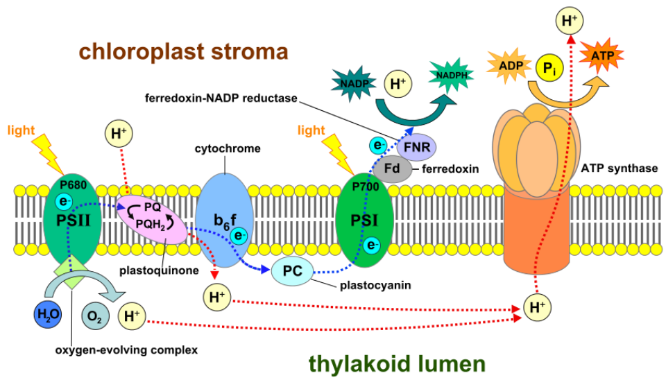· 过程:光 + 水 = 氧气+化学能(储存在ATP中)+还原氢(NADPH)