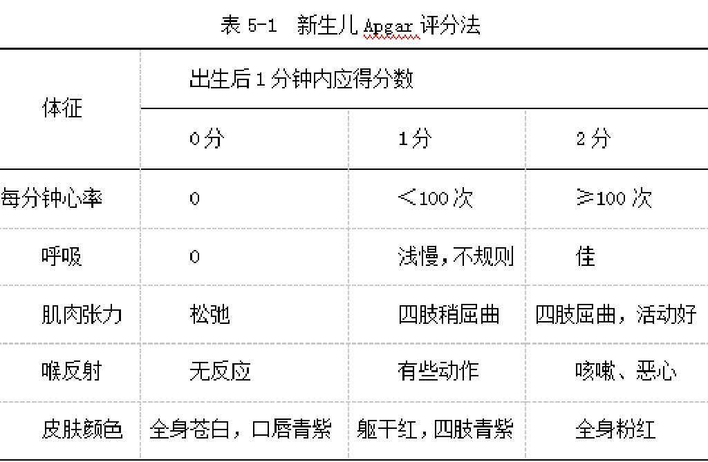 (一)新生儿体格检查:Apgar评分是用于判断有无新生儿窒息及窒息的严重程度。对新生儿娩出后1分钟的心率、呼吸、肌张力、喉反射及皮肤颜色5项体征进行评分并记录。每项为0~2分,满分为10分。8~10分属正常新生儿;4~7分为轻度窒息,又称青紫窒息,需清理呼吸道、人工呼吸、吸氧、用药等措施才能恢复;0~3分为重度窒息,又称苍白窒息,缺氧严重需紧急抢救,行喉镜在直视下气管内插管并给氧。对缺氧较严重的新生儿,应在出生后5分钟、10分钟时再次评分,直至连续两次评分均≥8。