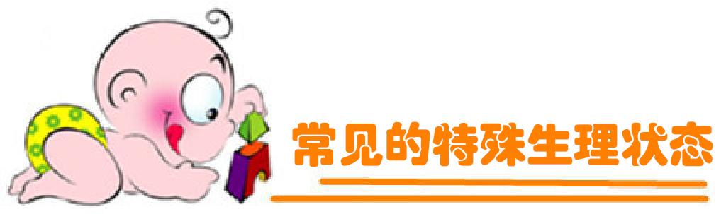 生理性体重下降:下降的范围约为出生体重的6%~9%,最多不超过10%。7~l0日恢复到出生时的体重。生理性黄疸:一般于出生后2~3日出现,5~7日最重,10~14日消退。乳腺肿大,假月经:部分女婴在出生后5~7日阴道可见少量血性分泌物或大量非脓性分泌物,可持续1周称假月经。“马牙”和“螳螂嘴” 由于上皮细胞的堆积或粘液腺分泌物的积留,新生儿口腔上颚中线和齿龈切缘上常有黄白色、米粒大小的小颗粒,俗称“马牙”;于生后数周至数月后自行消退。新生儿粟粒疹。