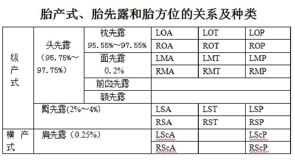 胎先露由定义是最先进入骨盆入口的胎儿部分。纵产式有头先露、臀先露、横产式有肩先露。胎方位定义是胎儿先露部的指示点与母体骨盆的关系称胎方位,简称胎位。指示点分别为枕先露——枕骨、臀先露——骶骨、肩先露——肩胛骨、面先露——颏骨。