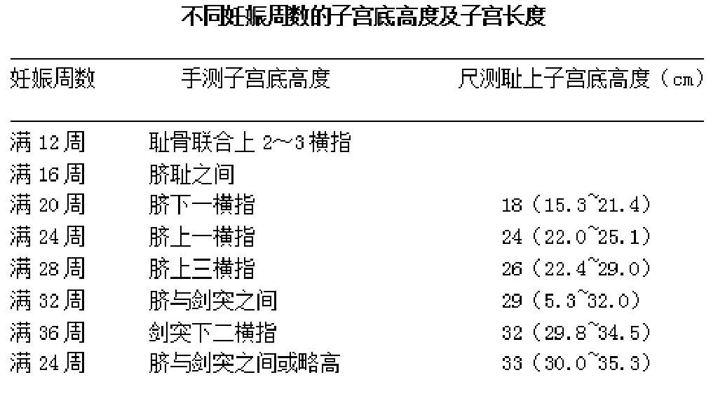 临床表现:有早期妊娠的经过,感到腹部逐渐增大、可感觉到胎动、触及胎体、听诊有胎心音子宫增大是通过测量宫底高度,可判断孕周数。(见下表)