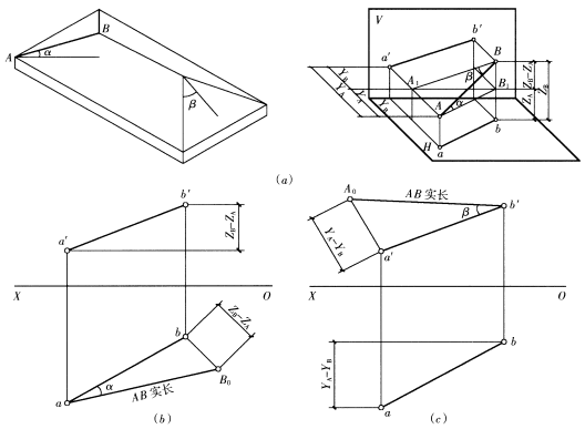 如下图(b)所示,过b点作ab的垂线,取长度等于ZB-ZA,连接三角形,则斜边aB0为所求实长,∠baB0为所求倾角α。同理,可在v面投影图上求实长和倾角β,如下图(c)所示。