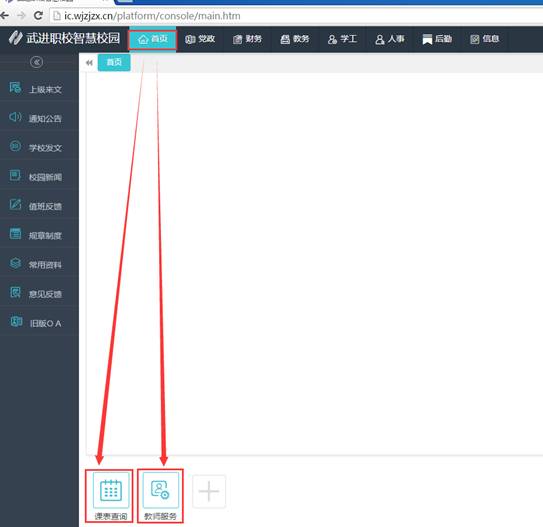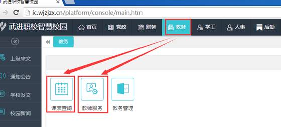 新平台首页提供了很多功能模块,在使用的过程中,除了采用常规模式进入各模块,对于我们经常使用的功能模块,我们也可以采用定义快捷方式的方法,这种方法可以快速进入对应功能。以“教务”模块为例,我们要查看教师课表或进行“教师服务”操作,必须先进入“教务”模块,然后再选择对应服务: