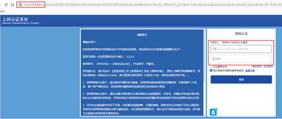 4、此时需要进行身份认证。打开浏览器,任意进入一个网站,浏览器自动跳转至身份认证页面。(注:任意输入网址即可跳转至身份认证界面,如无法正常跳转,请在浏览器输入地址:3.3.3.3,苹果系统因为其强制安全性,建议安装UC浏览器后使用。)