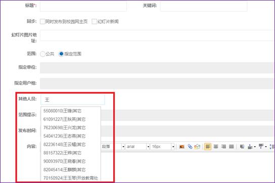 注:若指定的范围除了某个单位之外,还有其他个别对象,或者发布信息的对象仅仅局限于某几个人(不一定在一个单位之内,或者不需要发布到整个单位的所有人),可以使用“其他人员”功能。