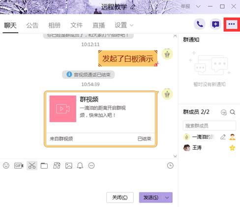 1. 打开你自己的QQ,然后打开一个QQ群,点击界面右上角“…”符号,单击“群视频”。