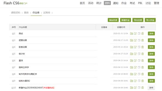 2、已有作业布置:进入课程“首页”,从“资料”导航栏进入资料列表。点击“作业库”按钮,进入作业库界面。