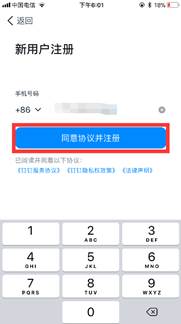 4.进入新用户注册界面,输入注册的手机号,单击“同意协议并注册”,如下图所示: