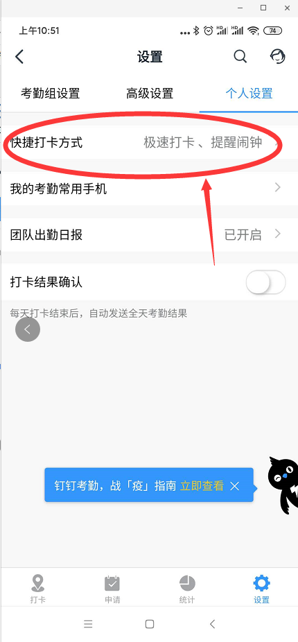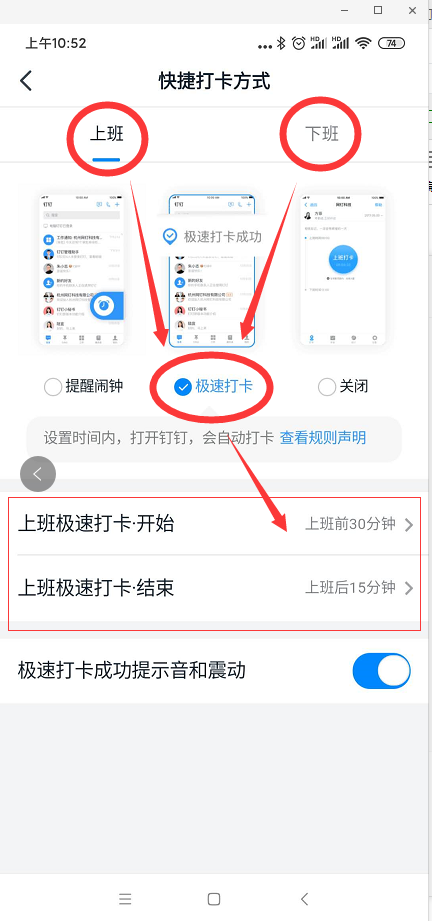 极速打卡开启后,在设置的上下班时间范围内且到达考勤组的地点,打开钉钉就能打卡成功了,不用亲自手工打卡。
