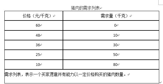 从需求列表和需求曲线图中可发现,在其他条件不变的前提下,猪肉的需求量和价格成反向变化。