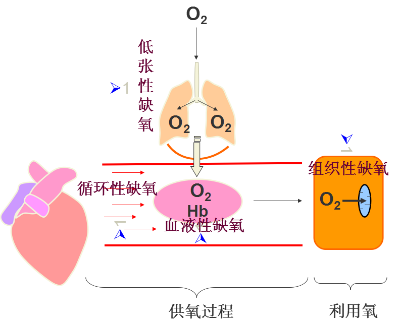 组织供氧不足或利用障碍,导致组织、细胞的代谢、功能和形态结构发生异常变化,称为缺氧。常用的血氧指标有: