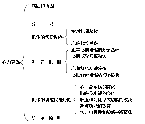 (二)心力衰竭的发病机制是心肌收缩或/和舒张功能障碍。前者由心肌细胞坏死和凋亡、心肌能量代谢紊乱、心肌兴奋-收缩耦联障碍导致。后者由心肌舒张功能降低、心室舒张势能减少、心室顺应性降低导致。