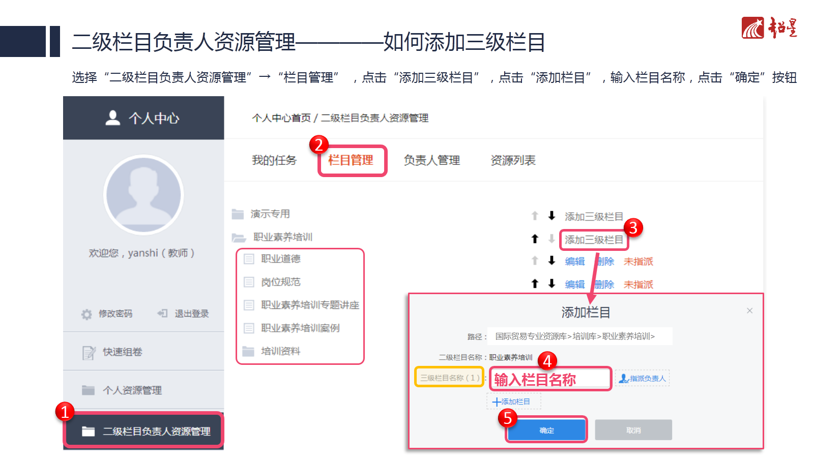 ②“添加三级栏目”时,若已确定栏目负责人,可点击“指派负责人”按钮,选择教师,则此教师负责建设新建的三级栏目。若未拟定负责教师,可只输入栏目名称,先建栏目不“指派负责人”。