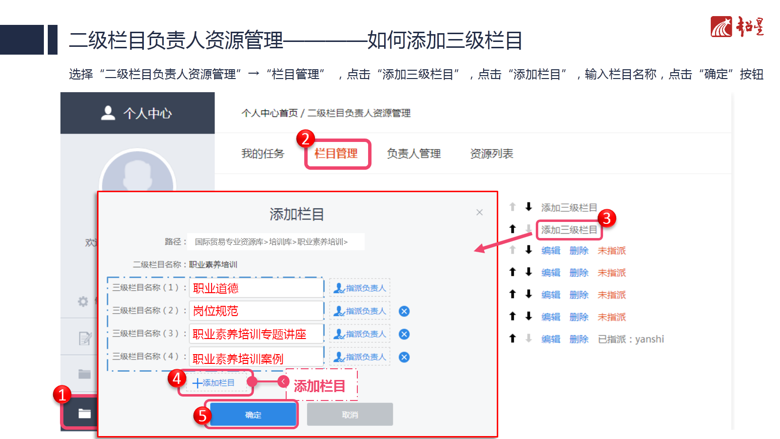二级栏目负责人添加三级栏目对应站点界面展示图: