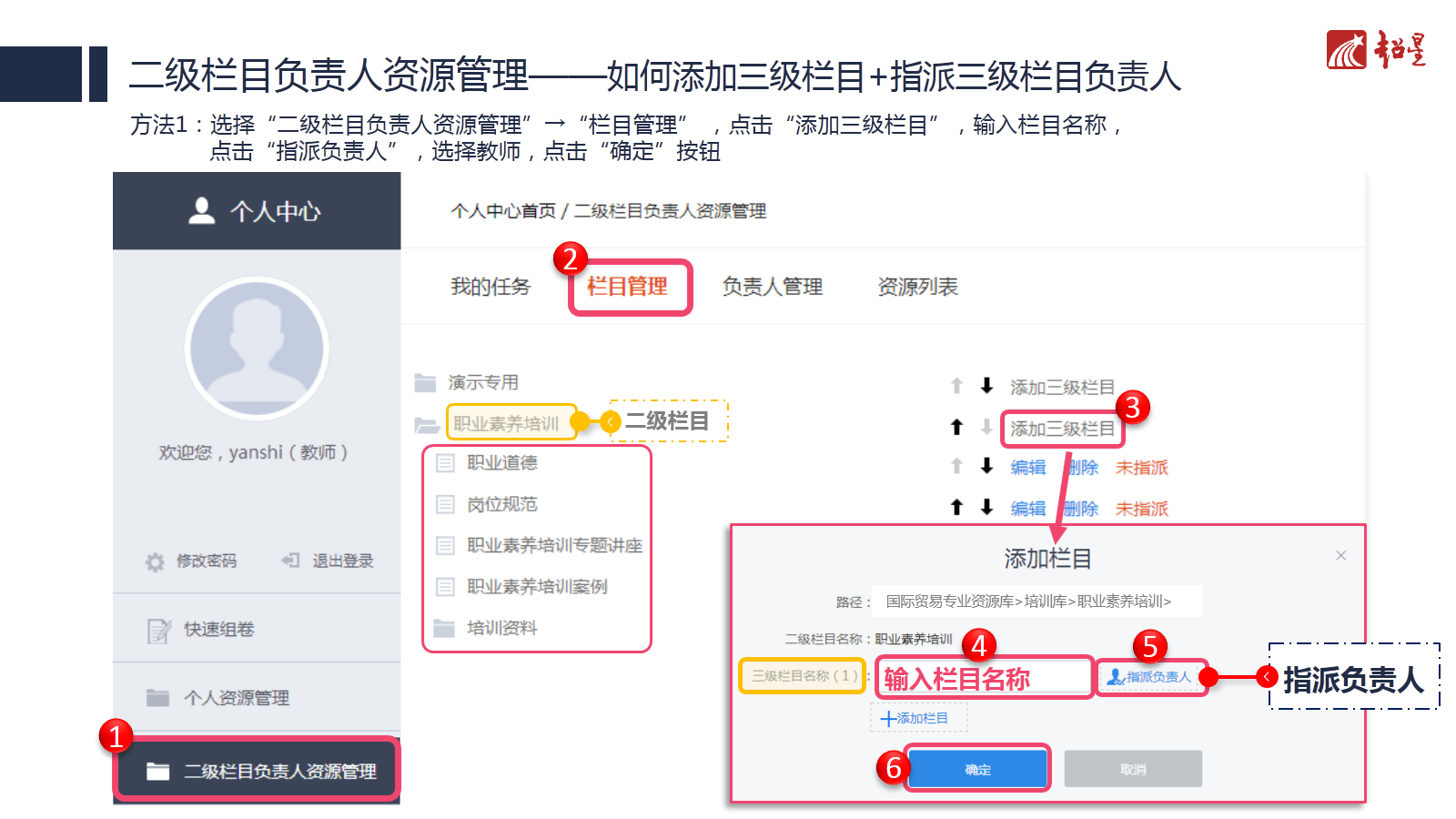 c. 在“添加栏目”弹出窗口中,输入“三级栏目名称”,点击“指派负责人”按钮,选择 教师,点击确定。