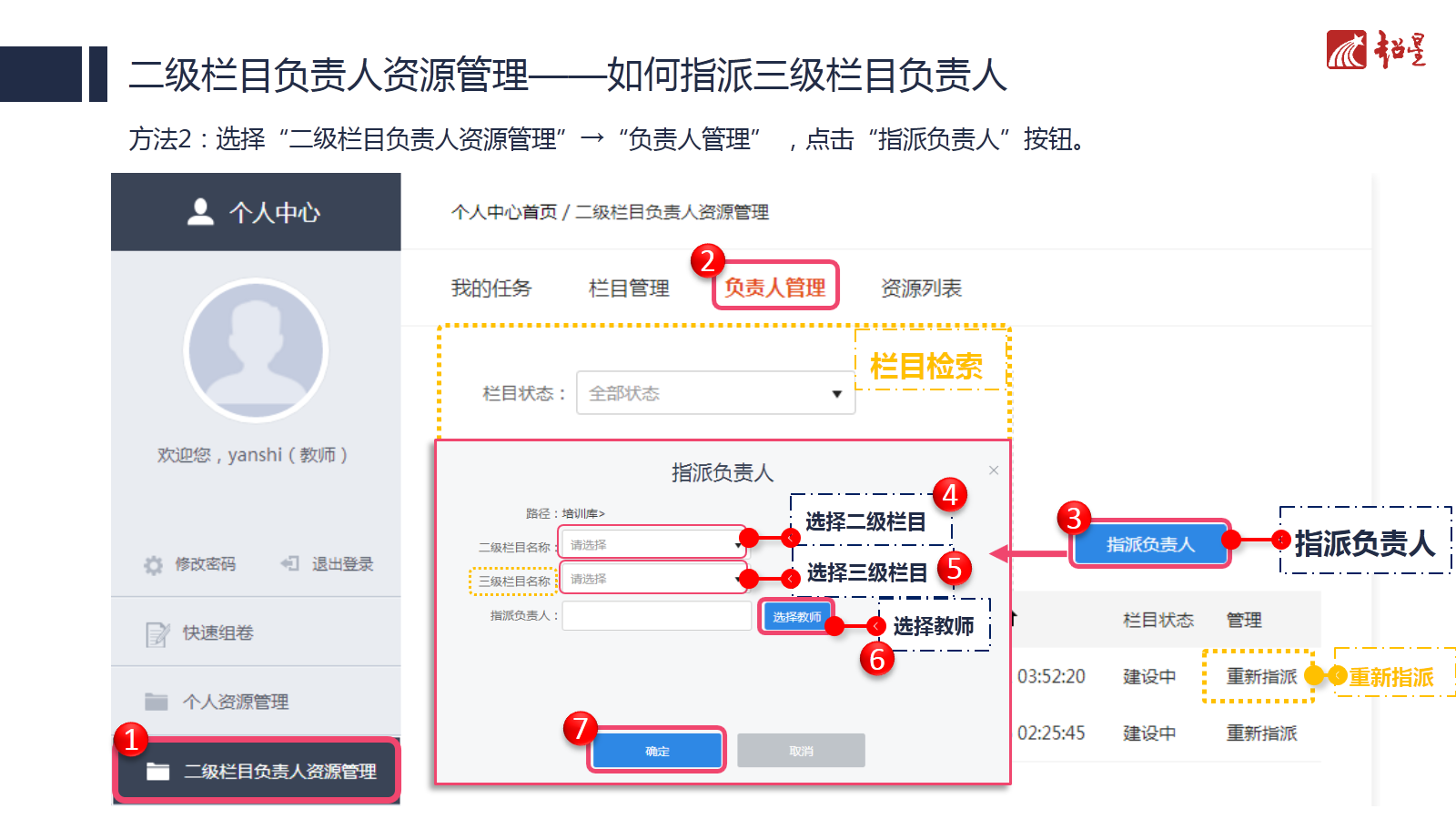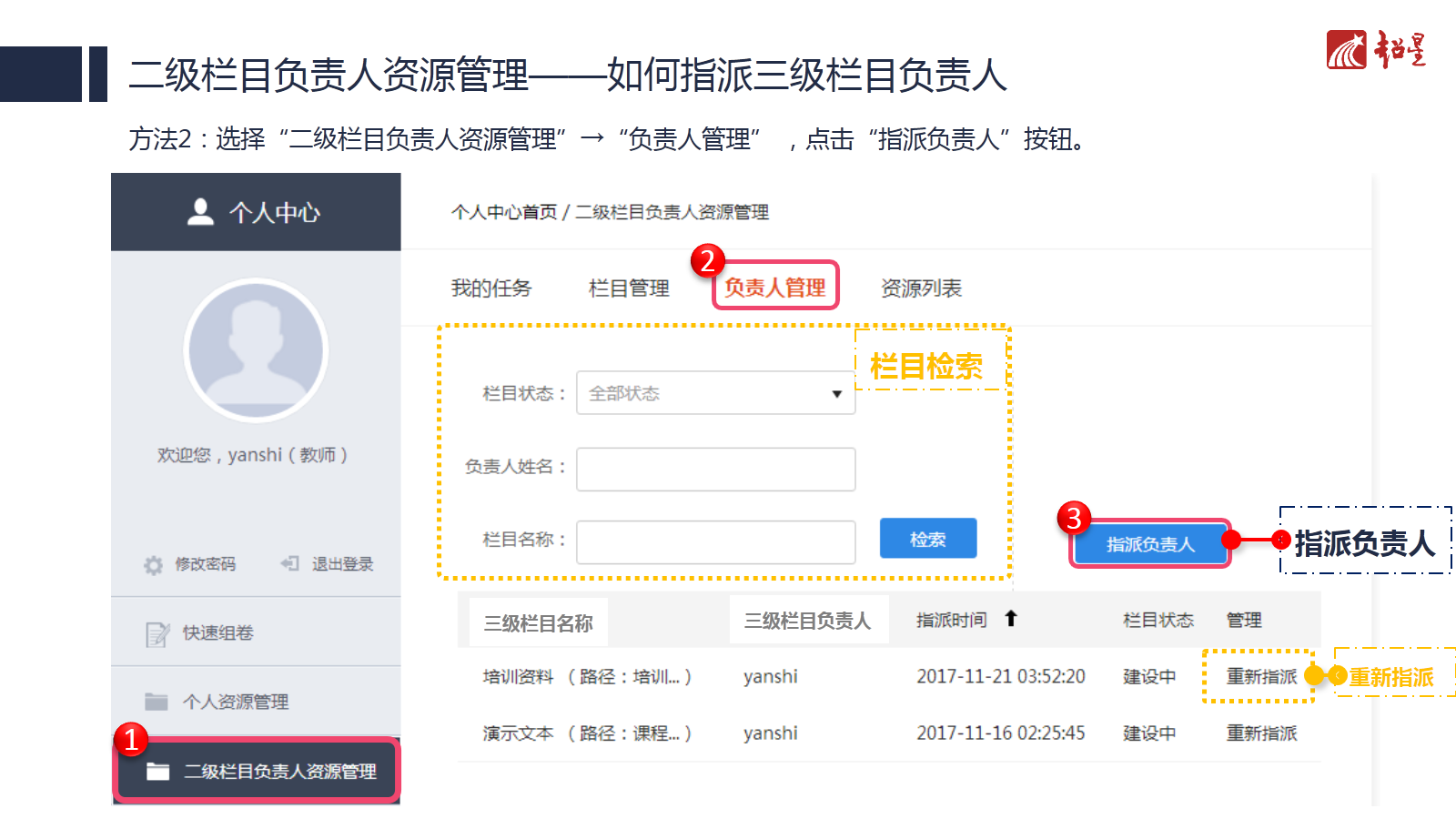 具体操作步骤:a. 二级栏目负责人资源管理→负责人管理