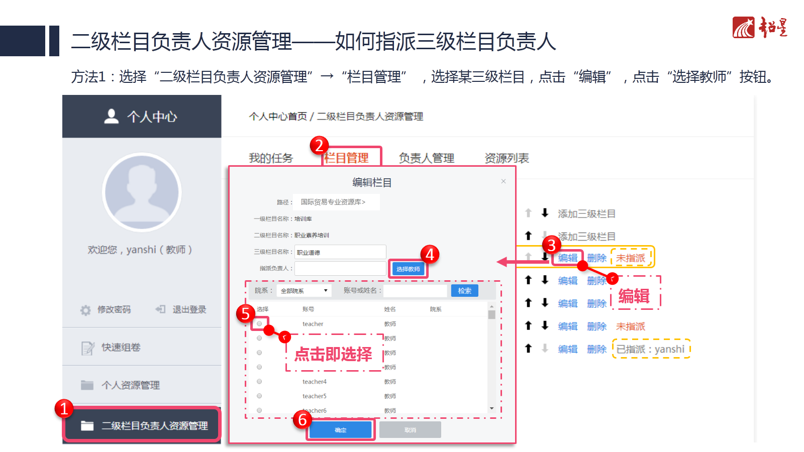 c. 在“编辑栏目”弹出窗口中,点击“选择教师”按钮,选择教师,点击确定。