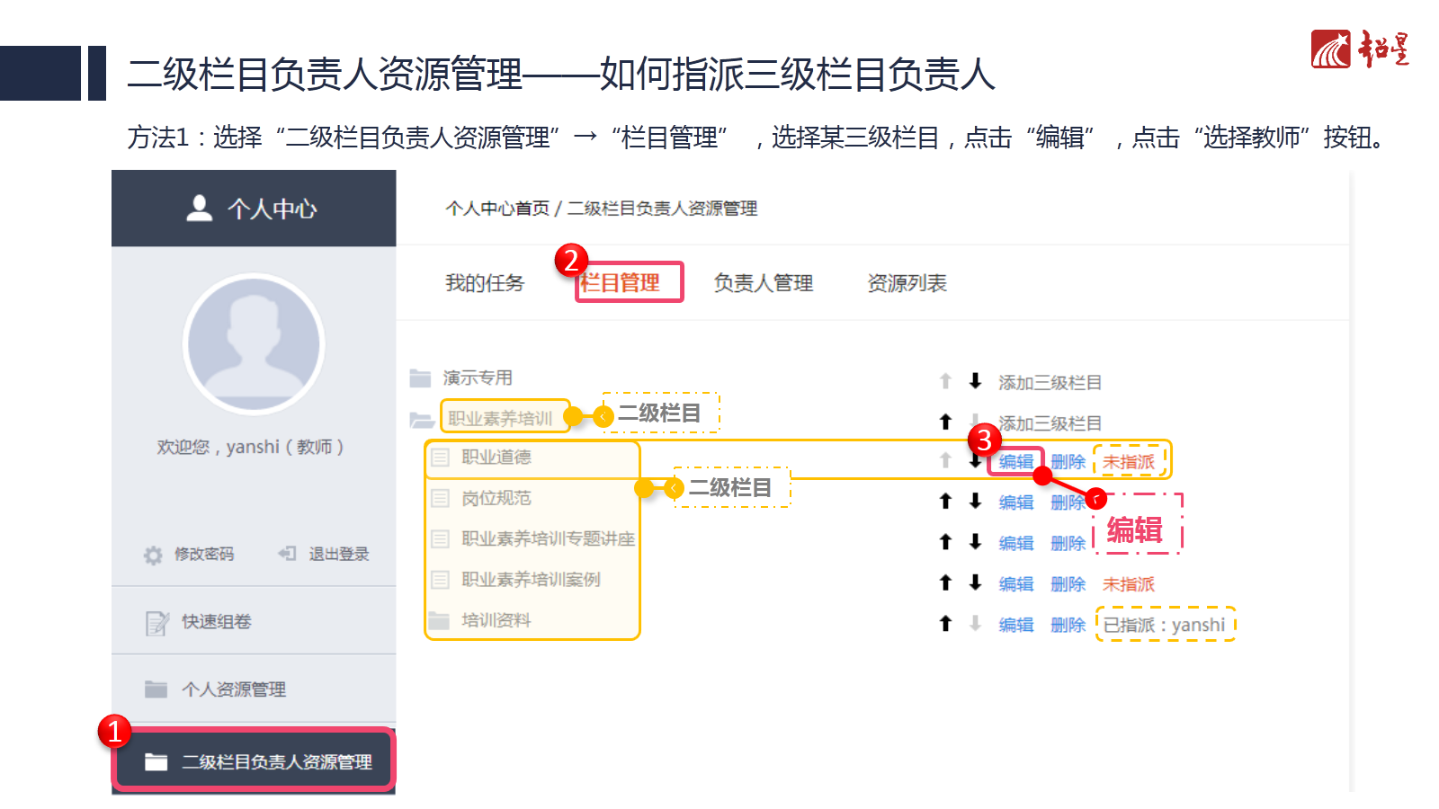 具体操作步骤:a. 二级栏目负责人资源管理→栏目管理
