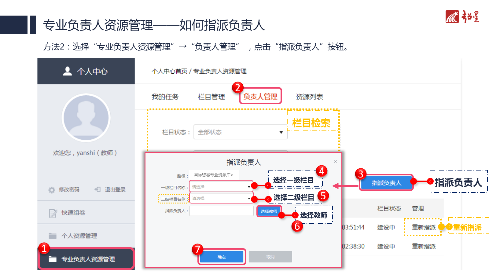 c. 在“添加栏目”弹出窗口中,输入“二级栏目名称”,点击“指派负责人”按钮,选择 教师,点击确定。