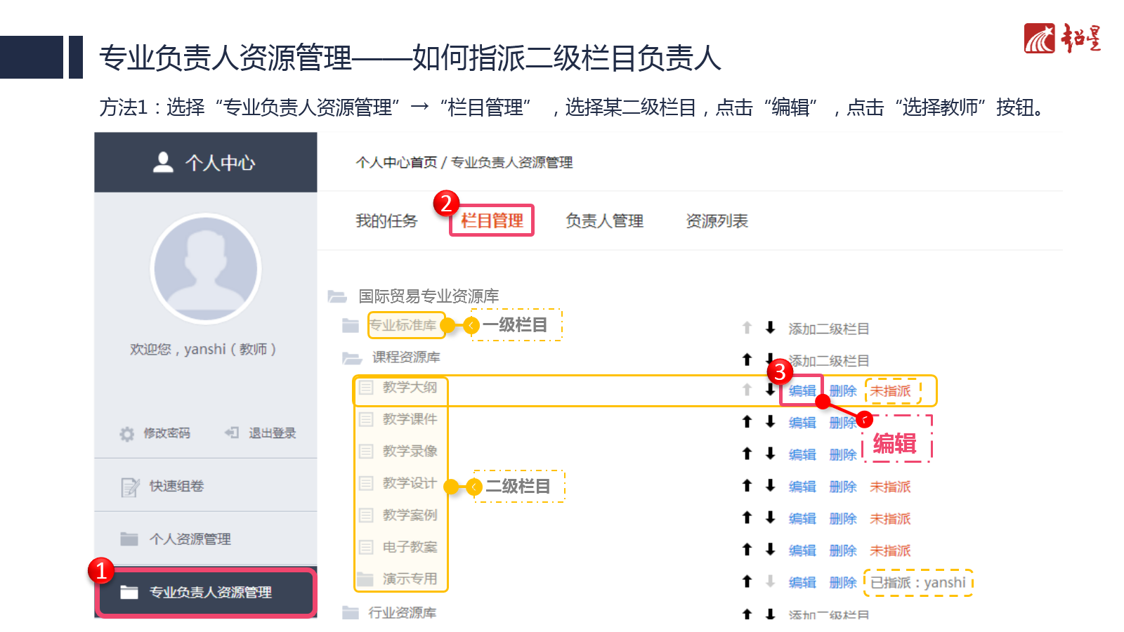 具体操作步骤:a. 专业负责人资源管理→栏目管理