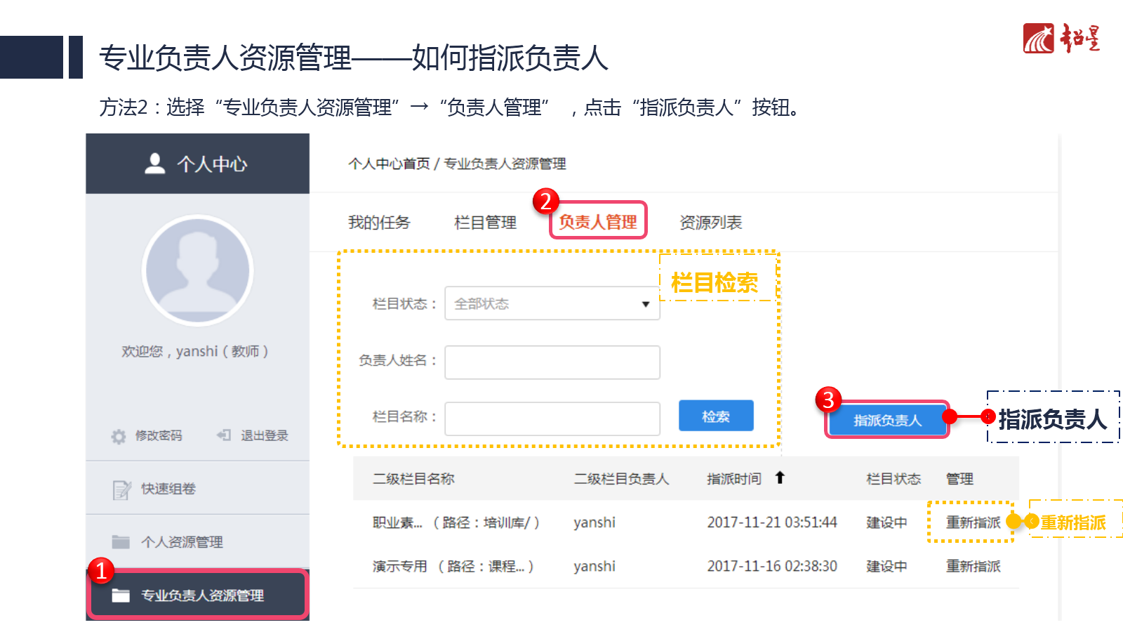 具体操作步骤:a. 专业负责人资源管理→负责人管理