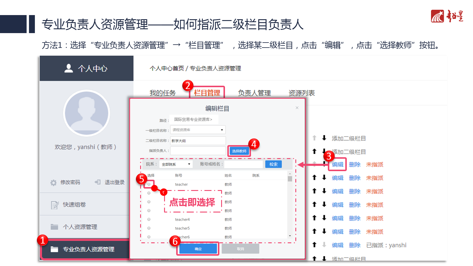 c. 在“编辑栏目”弹出窗口中,点击“选择教师”按钮,选择教师,点击确定。