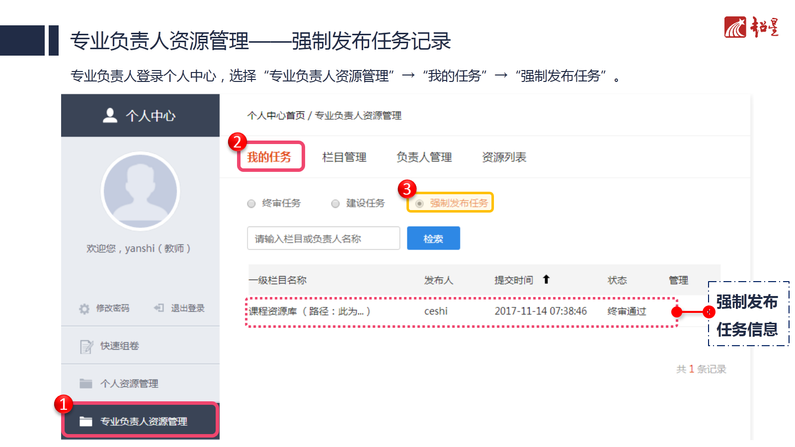 专业负责人登录个人中心,选择“专业负责人资源管理”→“我的任务”→“强制发布任务”。