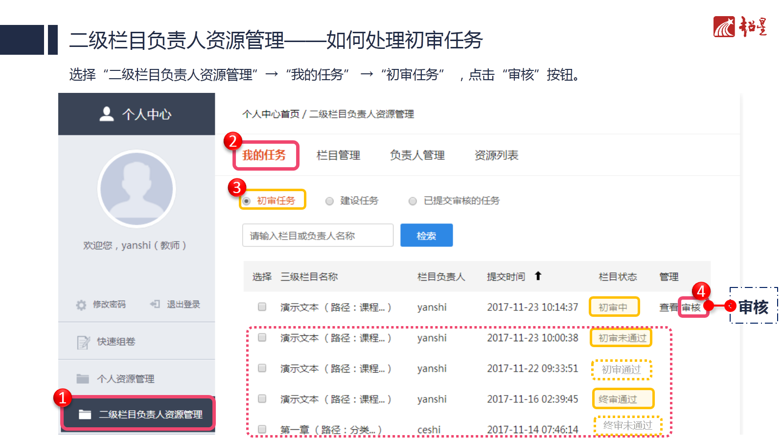 教师登录个人中心,选择“二级栏目负责人资源管理”→“我的任务” →“初审任务”,审核资源。