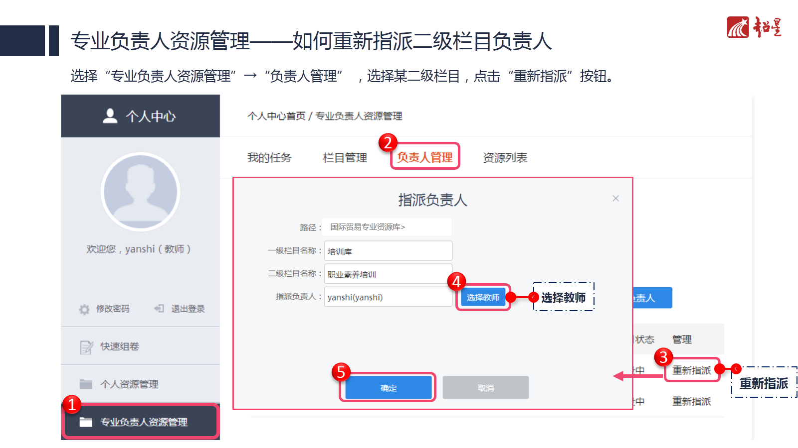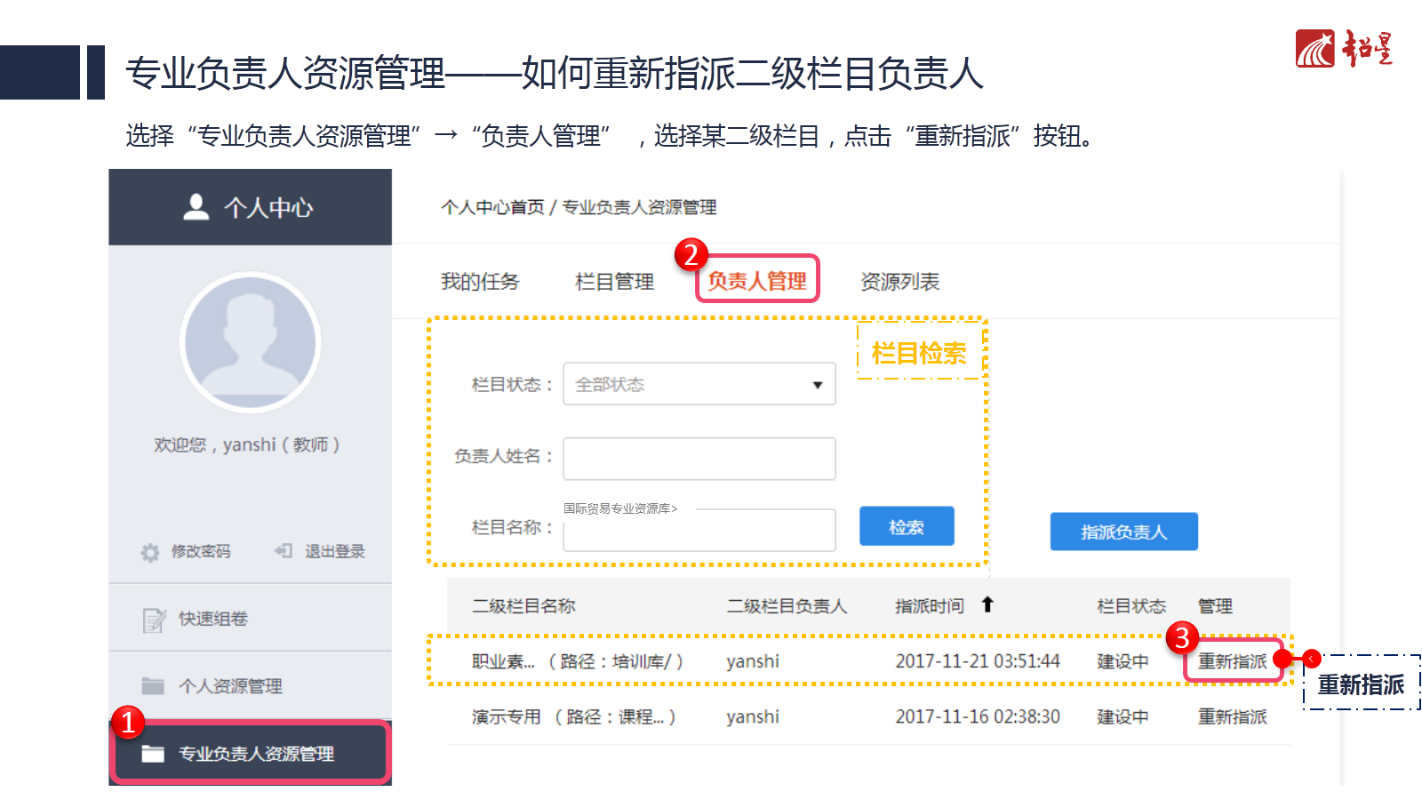 教师登录个人中心,选择“专业负责人资源管理”→“负责人管理”,选择某二级栏目,点击“重新指派”按钮。