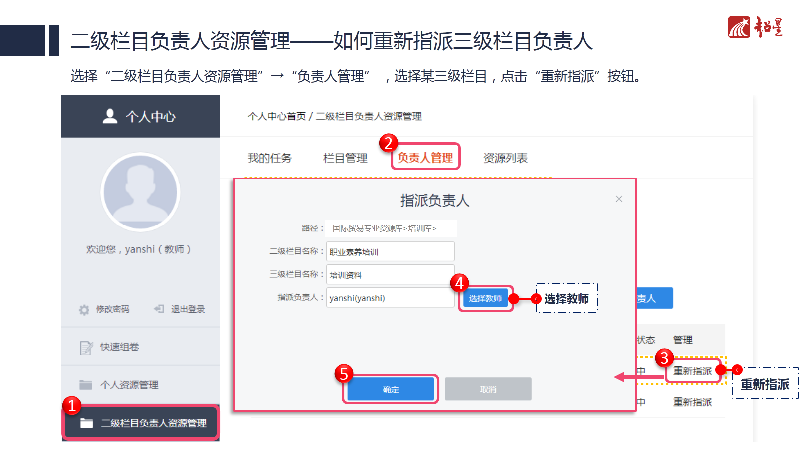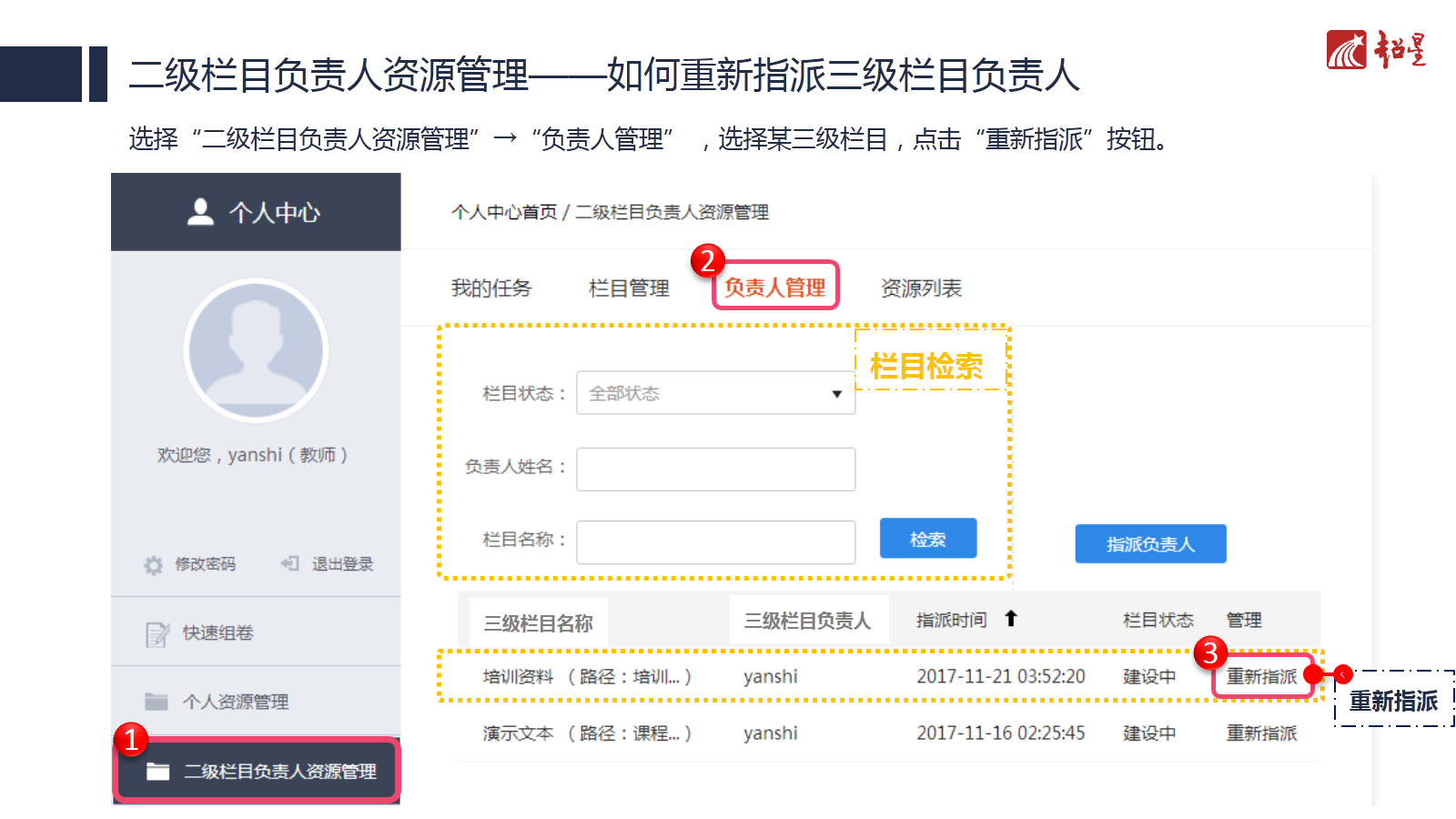 教师登录个人中心,选择“二级栏目负责人资源管理”→“负责人管理”,选择某三级栏目,点击“重新指派”按钮。