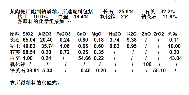 l由化学组成计算坯式、釉式是根据坯料、釉料化学成分数据(或配料中各种原料单独分析的结果),计算出符合坯式、釉式所规定的要求。其计算步骤按下述步骤进行。