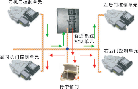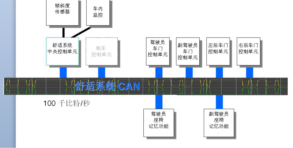 舒适系统CAN总线的联网控制单元包括自动空调控制单元、车门控制单元、舒适控制单元等。控制单元通过舒适CAN总线的CAN-H线和CAN-L线来进行数据交换,如车门开/关、车内灯开/关等。