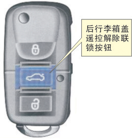 带无线电遥控器的车辆,遥控器上还有一个按钮用于对后行李箱盖单独进行遥控解锁。按钮位置如图所示。操作遥控器上的解锁按钮可对后行李箱盖解除联锁。如果后行李箱盖在两分钟内未被打开,则又会重新自动联锁。