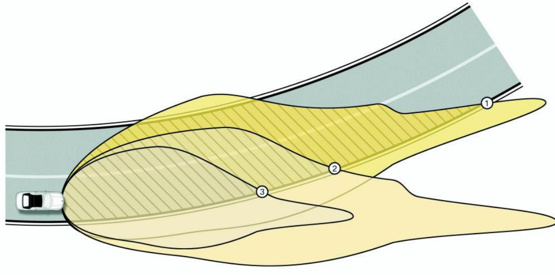 自适应前大灯能够在转弯时,向弯道方向转动双氙气远光灯和近光灯。自适应前大灯的控制单元要获得转向角、速度、偏航角速度等信号来调整双氙气大灯的水平照射角度。