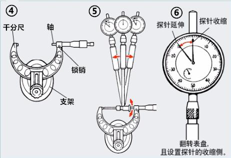 ⑤将百分表可调接杆头和测头放置于千分尺测砧和轴之间,以可调接杆与测砧的接触部位为支点,移动测头部位,观察百分表表盘示数。