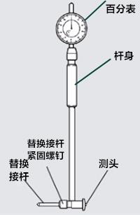 量缸表主要由量缸表杆身、替换接杆、替换接杆紧固螺钉、测头和百分表等装配组成,如图4-3-6。其中替换接杆的长度可随测量的缸径不同而更换不同长度的替换接杆。杆身上有专用于手持的部位,不可握持其他部位,否则容易引起杆身内传力杆件的受热膨胀而引起测量值的变化。测头部分为带弹性的可压缩部分,它受到压缩和弹出均通过传力杆件在百分表上显示。